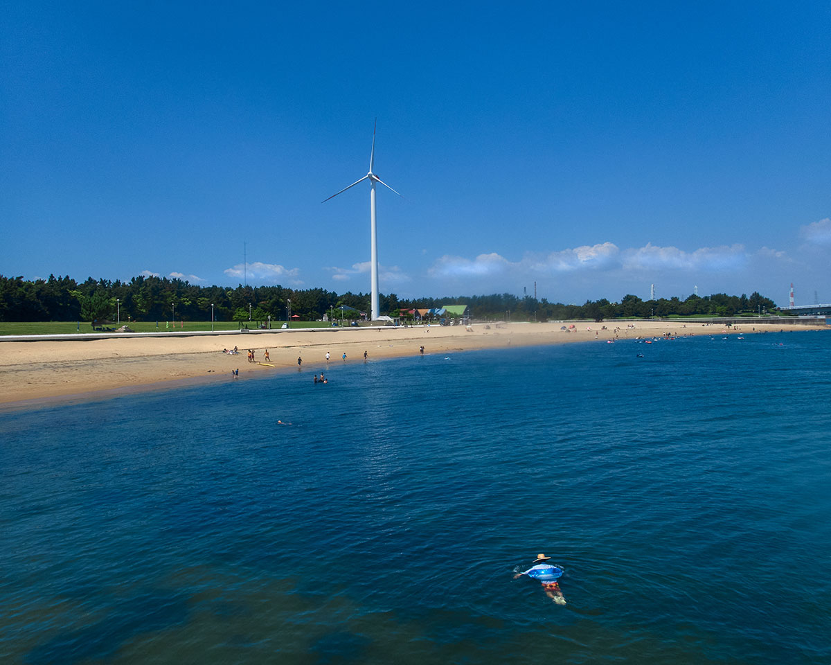 今日は人がまばらな砂浜 そして青い海が広がっている |